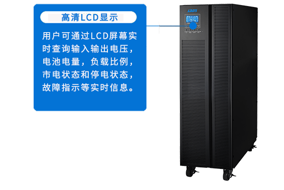 用戶可通過(guò)LCD屏幕實(shí)時(shí)查詢輸入輸出電壓,電池電量,負(fù)載比例,市電狀態(tài)和停電狀態(tài),故障指示等實(shí)時(shí)信息。